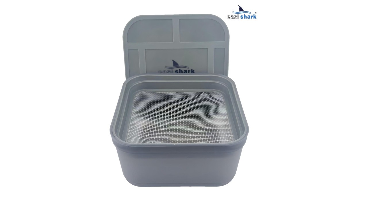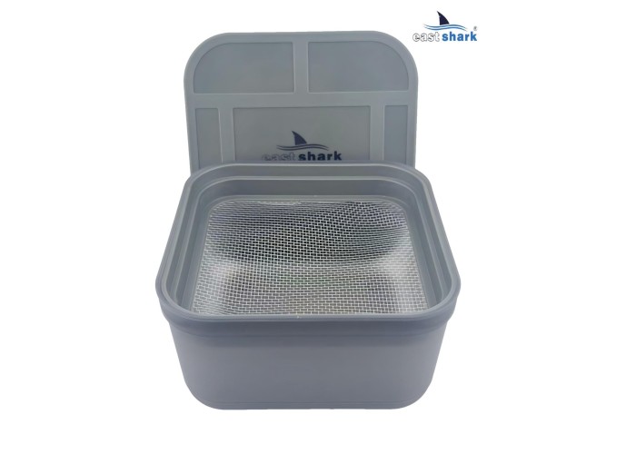 Данный контейнер приспособлен для хранения прикормки и насадок. Также в контейнере есть сито для наживки (15*15, 2 мм*2 мм)