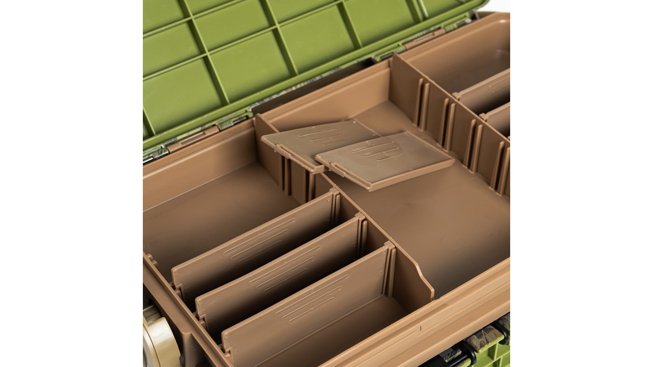 Большой внутренний отдел общим размером 35-18-20 см (Д*Ш*В) с возможностью разделения перегородками, вмещает большое количество коробочек или других рыболовных принадлежностей. Ориентируясь на размеры, в ассортименте EastShark можно подобрать коробочки с разной компоновкой, которые идеально помещаются в большом отделе ящика, например модели: A-0403, A-0404, MD-C10115, MD-C20315 и другие подходящие по размеру.
