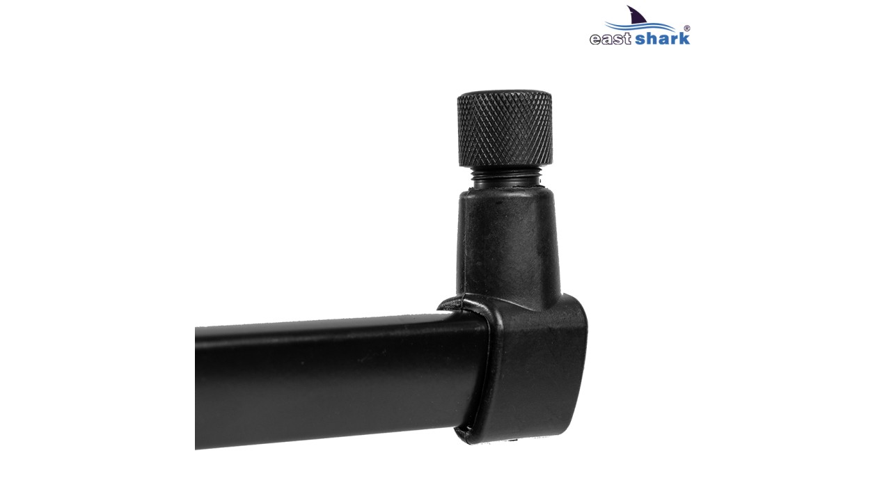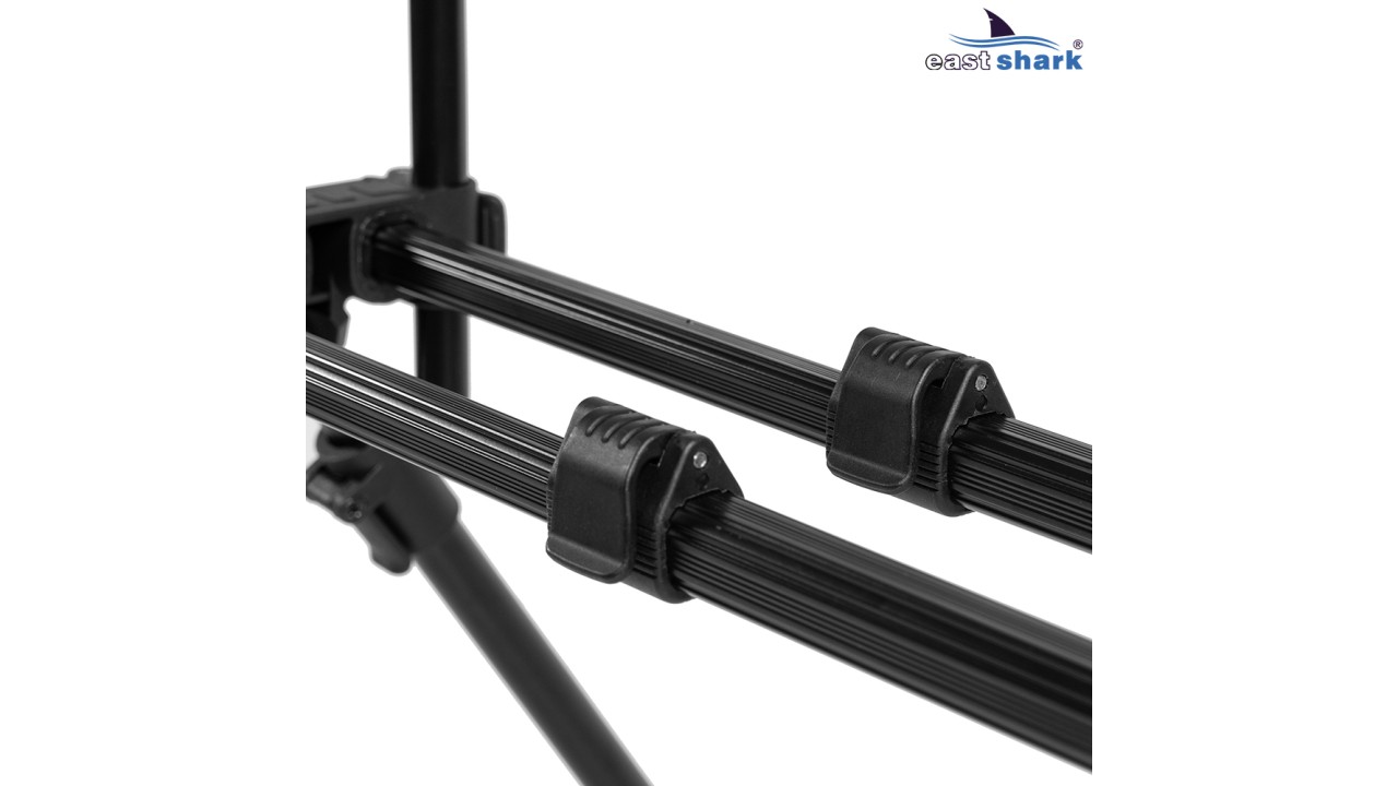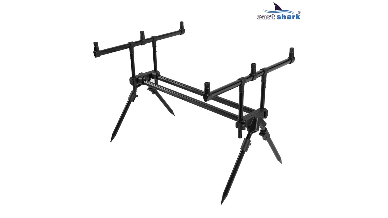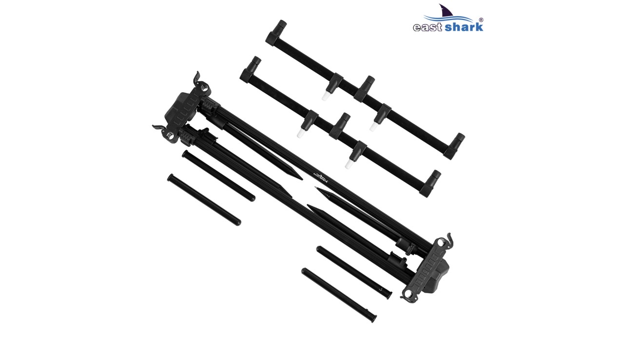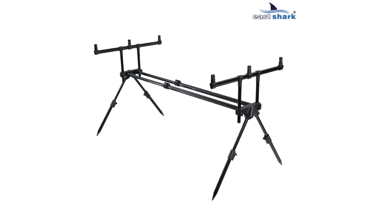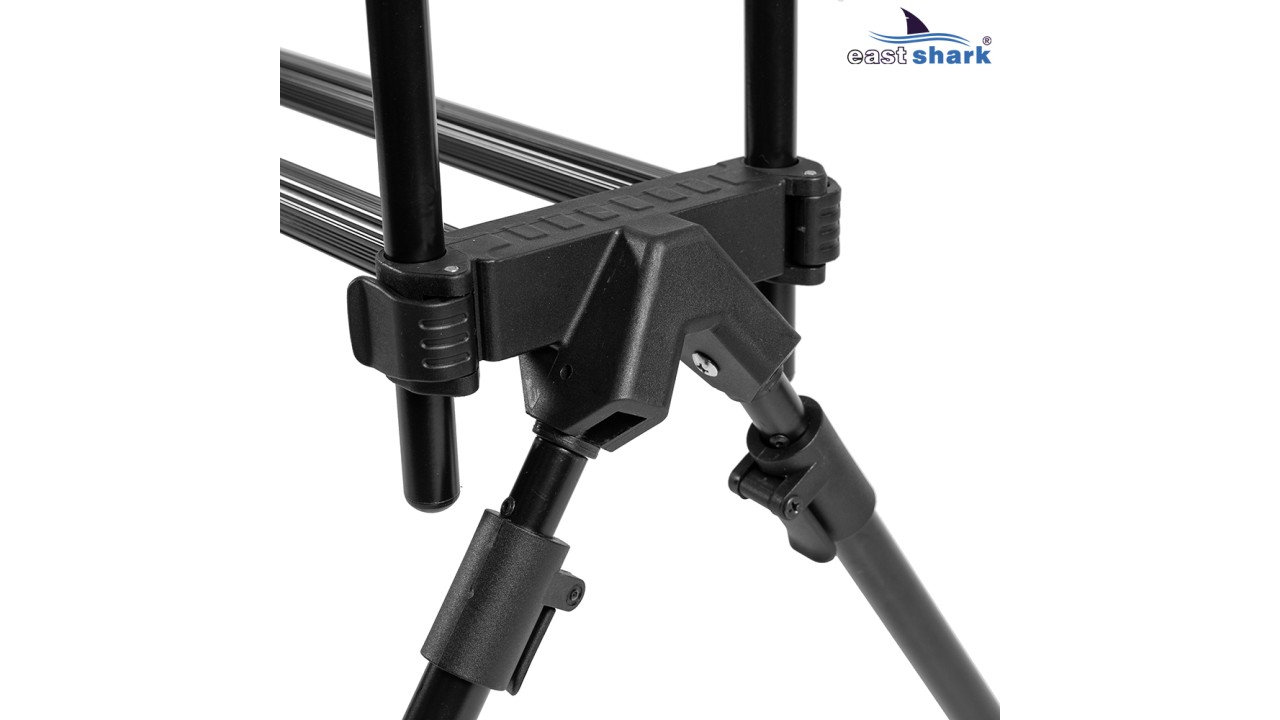 Имеет телескопические ножки с регулировкой длины и угла наклона, что позволяет наклонять/задирать удилища относительно горизонта, а так же, устанавливать на неровной поверхности.
