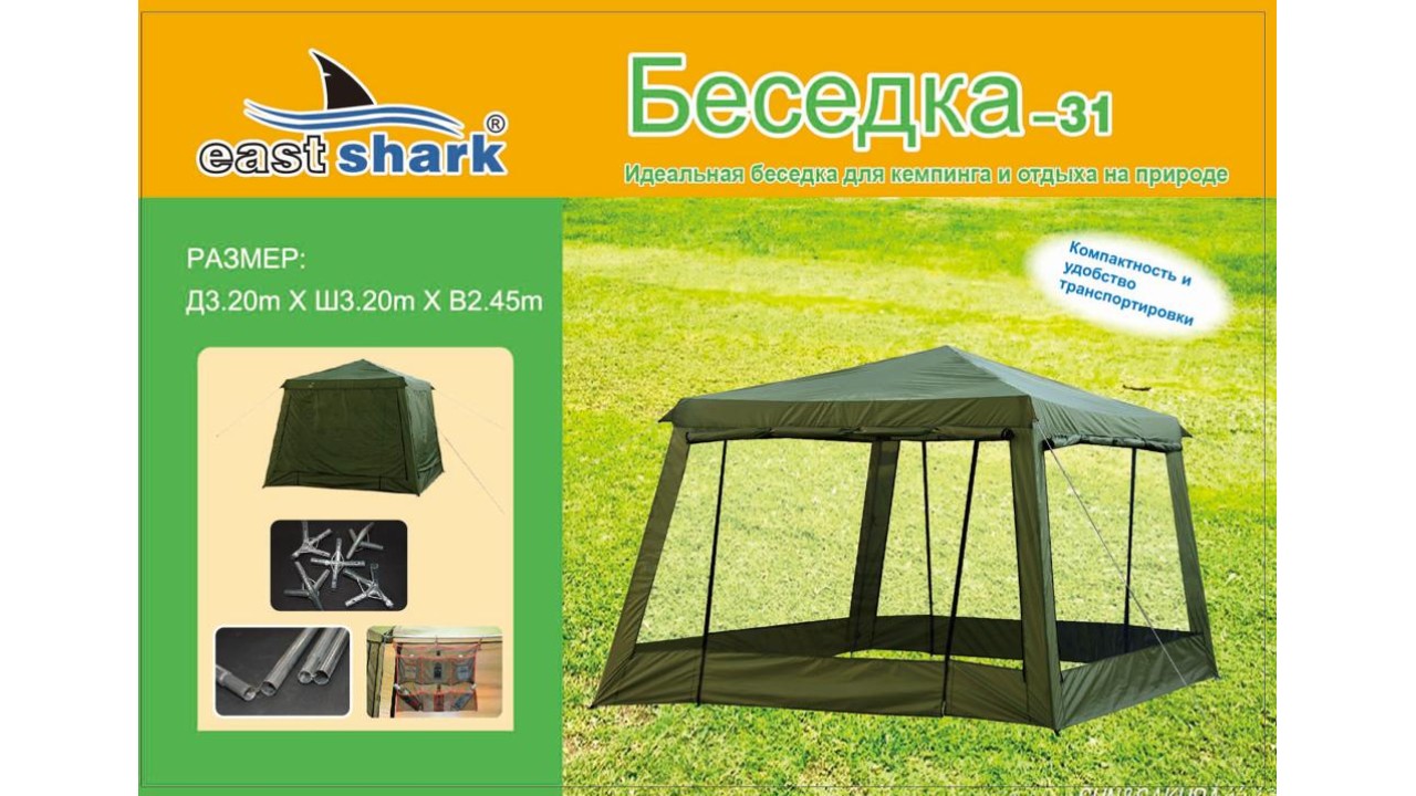 Прочный каркас шатра изготовлен из стали, поэтому вся конструкция устойчива к ветру. Все части каркаса надежно фиксируются между собой.